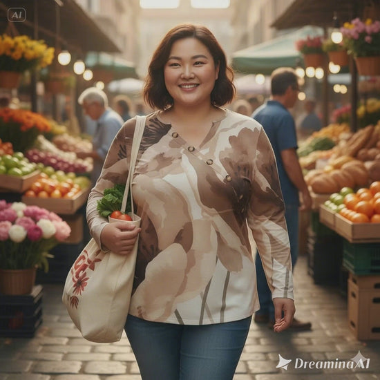 Autumnal softness & everyday comfort: breathable cotton-poly knit, asymmetrical 5-button collar, and a warm floral print for timeless chic. The easy top that elevates any outfit. Its asymmetrical collar, punctuated with small buttons, structures the neckline and catches the light; the watercolor floral print in natural browns adds a warm touch perfect for the transitional seasons. The cotton-poly blend is soft, lightweight, and feels great against the skin: ideal from the office to the weekend. Wear it with jeans, wide-leg trousers, or joggers for effortlessly smart casual style. Inclusive up to size 5XL, it adapts to you—not the other way around.