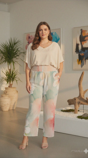 Spring freshness, stretch comfort, and a fluid silhouette: from the sofa to a spontaneous outing, it moves with you effortlessly. Imagine a gentle breeze. These watercolor floral print pants with a high smocked waistband fit without feeling tight. The wide leg and breathable fabric (95% polyester, 5% elastane) move with you and stay light even in warm weather. Perfect for everyday wear, yoga, a stroll, a city break, or a relaxed evening. Pair them with a white T-shirt, a nude tank top, or a bodysuit: instant chic, absolute comfort, inclusive—they adapt to you, not the other way around.