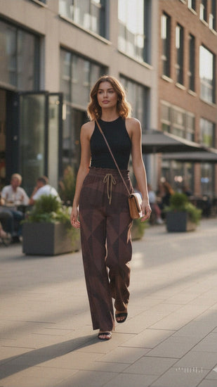 Lightweight comfort + urban style: a fluid cut, adjustable waist, and brown geometric print make these pants perfect for year-round wear. The ultimate in chic and effortless style. These geometric-patterned trousers in cocoa tones adjust to your waist thanks to their elasticated waistband with a drawstring. The wide leg falls elegantly, the pockets hold your phone and keys, and the stretch knit (95% polyester, 5% elastane) breathes in warmer weather. Wear them with a tank top, an oversized shirt, or white sneakers for an instantly casual-chic look, from the office to weekend outings. Inclusive and flattering, they adapt to you, not the other way around.