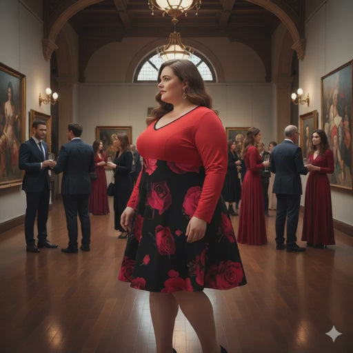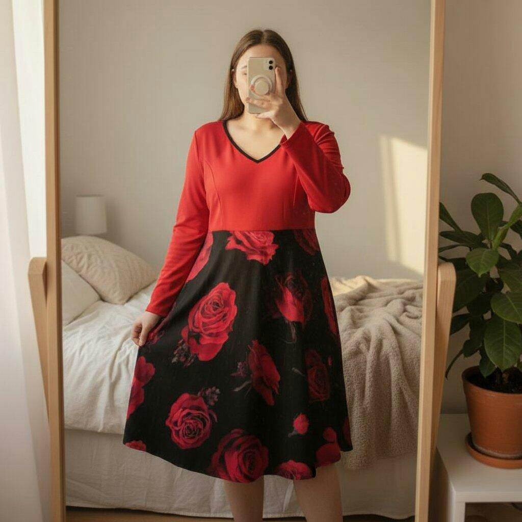 ✨Flowing V-neck dress with a red bodice and a black rose-print skirt. Soft and stretchy fabric (95% polyester, 5% elastane), flattering cut for all body types. Perfect for everyday wear, a night out, or Valentine's Day. 📖 When you slip it on, it's effortless: the V-neck delicately accentuates the décolletage, the waist is defined without constricting, and the flared skirt dances gracefully around the legs. The red and black contrast, punctuated with deep roses, adds just the right touch of romance and confidence.