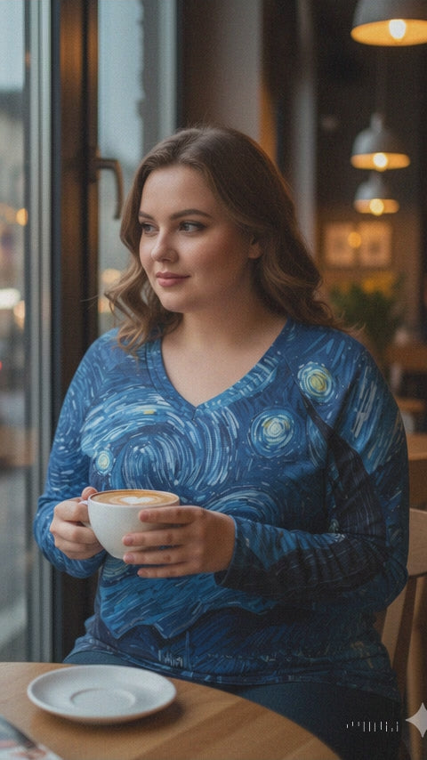 Loose long-sleeved V-neck T-shirt – “starry night” print (S to 5XL)