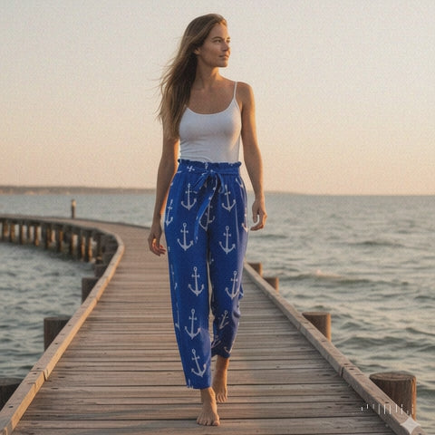 Pantalón marinero de pierna ancha con cintura elástica y lazo, con bolsillos – estampado de ancla – S a 5XL