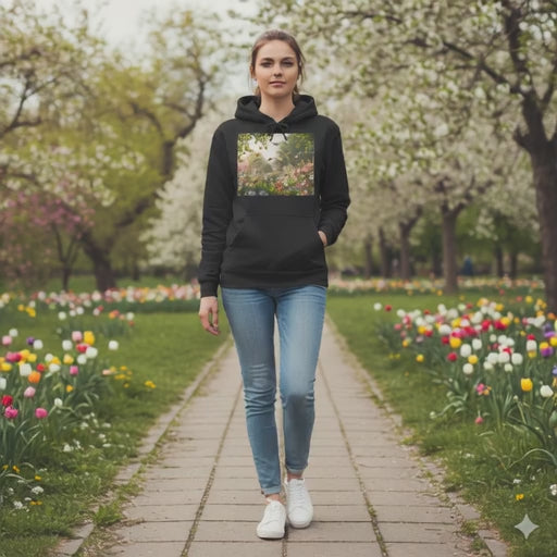 La luz se filtra entre las hojas, las abejas danzan, las flores florecen. Esa sensación perdura en esta sudadera con capucha: una imagen de jardín estampada con precisión que te relaja y te levanta el ánimo. La mezcla de algodón hilado en anillo y poliéster es suave y transpirable, la capucha ajustable y el bolsillo tipo canguro aportan comodidad, y el corte unisex holgado es ideal para cualquier situación. Arte para llevar a diario.