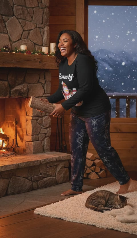 Un conjunto de invierno ultra cómodo: una camiseta negra de manga larga con estampado de muñecos de nieve y pantalones con copos de nieve y bolsillos. Tejido suave y elástico, corte holgado, tallas XS a 6XL. Perfecto para estar en casa, viajar o regalar. Cierra la puerta, prepárate una infusión y disfruta de tu nuevo ritual de enero. Este pijama de dos piezas te envuelve en un tejido suave y ligeramente elástico que se adapta a tu cuerpo sin apretar. La camiseta negra de cuello redondo alegra tus noches con su estampado de muñecos de nieve y copos de nieve, mientras que los pantalones con copos de nieve, con prácticos bolsillos, te permiten ir del sofá a un brunch tardío.