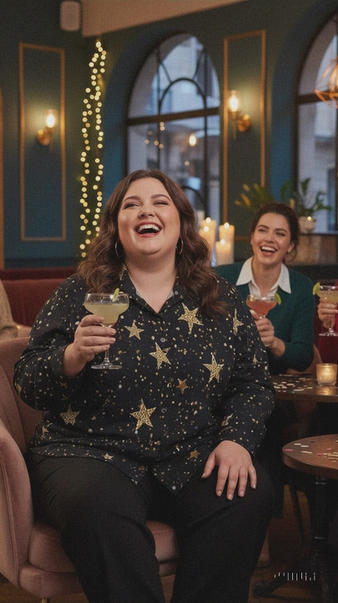 Effet wahou instantané : ourlet irrégulier, tombé fluide et pluie d’étoiles dorées pour briller au quotidien comme en soirée. L’alliée parfaite des looks chic-faciles. Légère et douce, cette chemise en polyester premium épouse le mouvement sans coller. Son ourlet asymétrique affine visuellement, le col chemise structure la silhouette et l’imprimé d’étoiles illumine la tenue. Portez-la rentrée dans un pantalon tailleur, ouverte sur un débardeur ou nouée avec un short : du bureau aux fêtes, elle attire tous les regards. Tailles inclusives S à 8XL — elle s’adapte à vous, pas l’inverse.