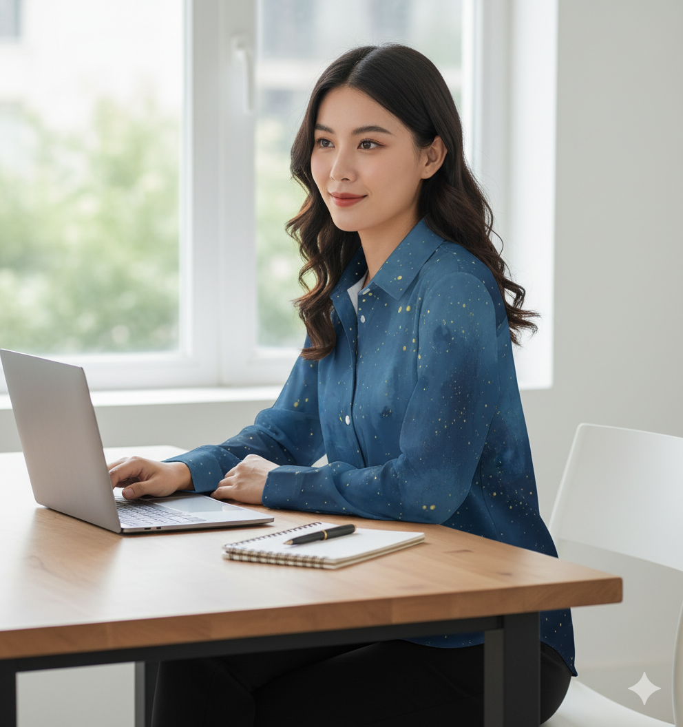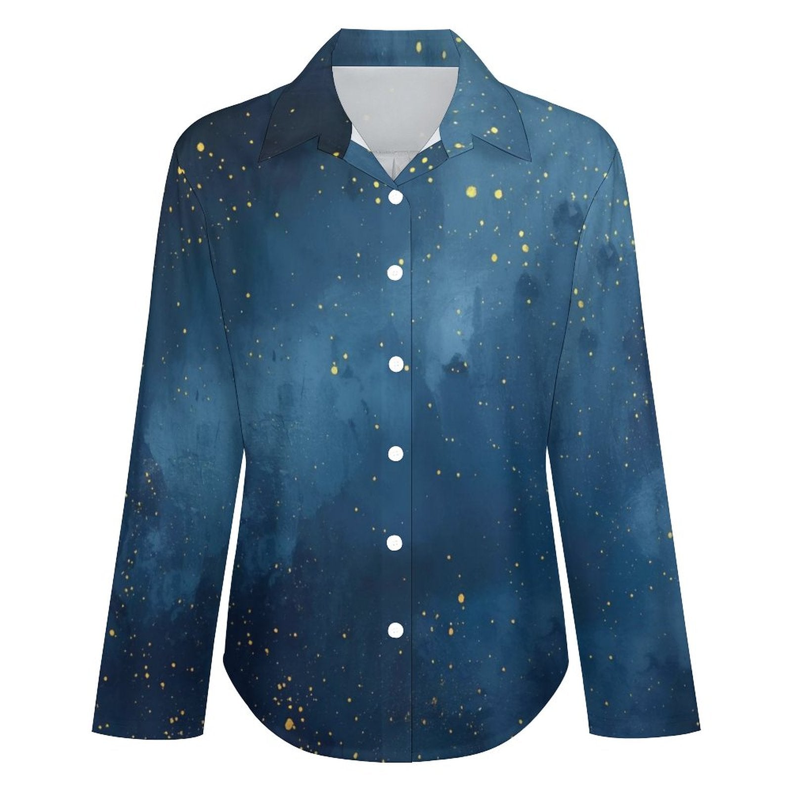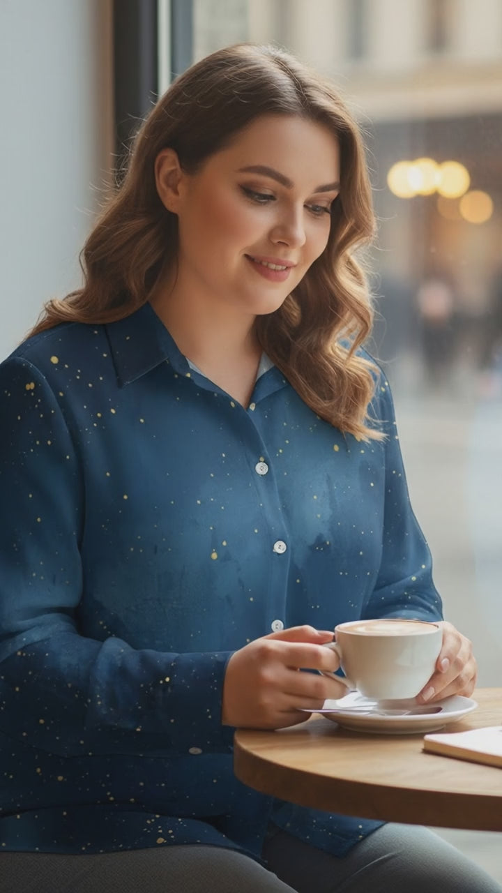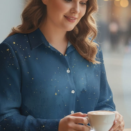 ✨ Légère, fluide et magnétique : une chemise bleu nuit constellée de points dorés pour sublimer vos looks d’automne-hiver et les soirées de fête. 📖 Invitation à lever les yeux vers les étoiles : cette chemise à ourlet asymétrique déploie un dégradé bleu profond piqué d’éclats dorés, comme un ciel clair au cœur de la nuit. Le polyester premium caresse la peau, respire et conserve un tombé net du matin au soir. L’impression intégrale par sublimation fixe les nuances et les contrastes pour un rendu durable. Glissez-la dans un jean noir pour un casual chic instantané, portez-la ouverte sur un top satiné pour un dîner, ou associez-la à un pantalon tailleur pour une allure sophistiquée. Inclusive par essence, disponible jusqu’au 8XL — la mode qui s’adapte à vous.