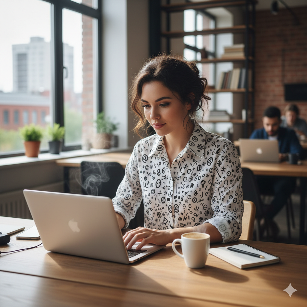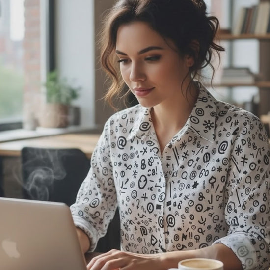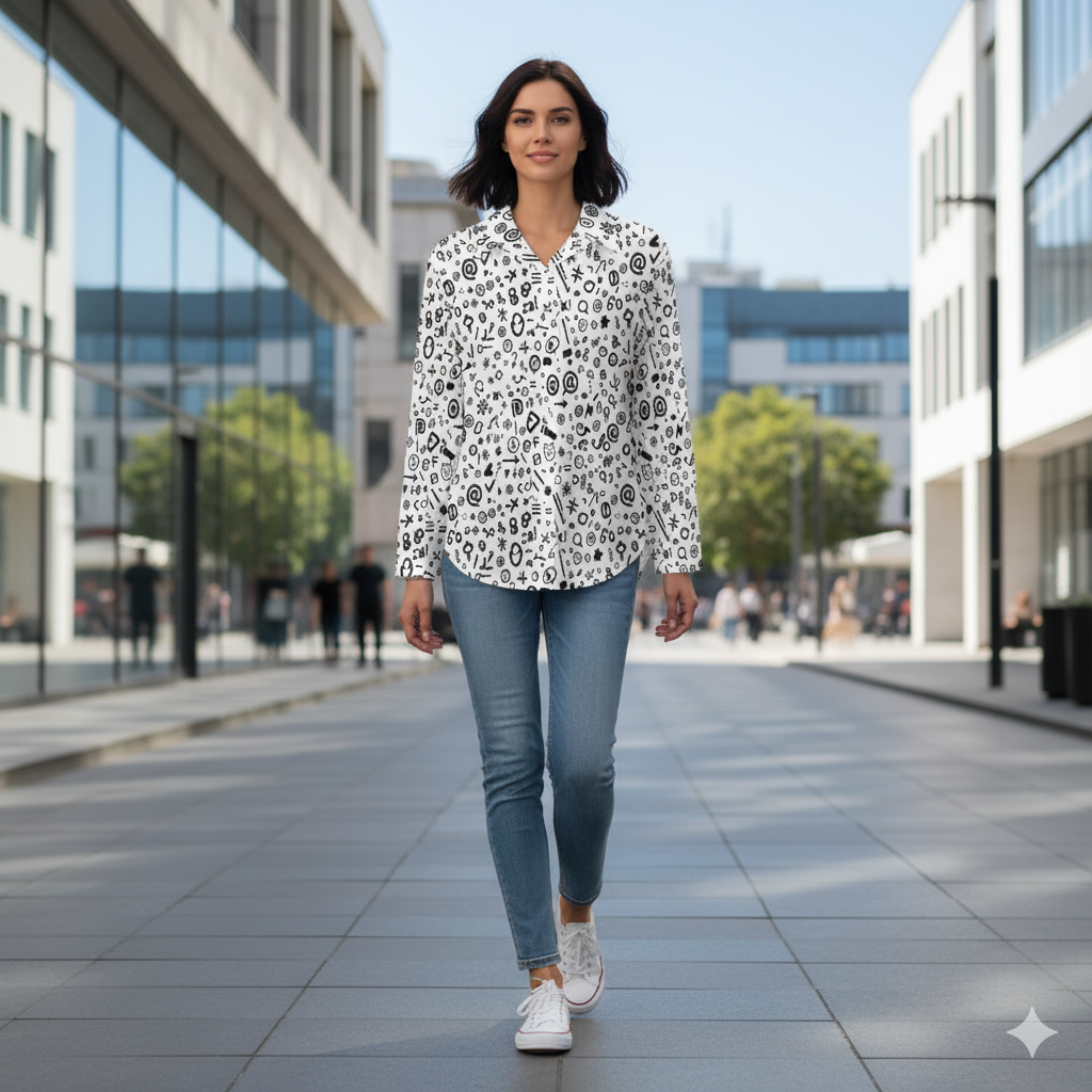 ✨ Légère, graphique et ultra-polyvalente : la chemise qui booste vos looks du bureau aux sorties. 📖 Besoin d’une pièce qui fait tout, tout de suite ? Cette chemise à ourlet asymétrique apporte une touche arty grâce à son imprimé intégral de symboles noirs sur fond blanc. Le polyester premium est doux et respirant ; la coupe fluide tombe parfaitement et allonge visuellement la silhouette. L’impression par sublimation fixe des contrastes nets qui résistent aux lavages. Portez-la rentrée dans un jean pour un style smart-casual, ouverte sur un débardeur pour une vibe street, ou avec un pantalon tailleur pour un rendez-vous pro. Inclusive par nature, disponible jusqu’au 8XL : la mode s’adapte à vous, pas l’inverse.