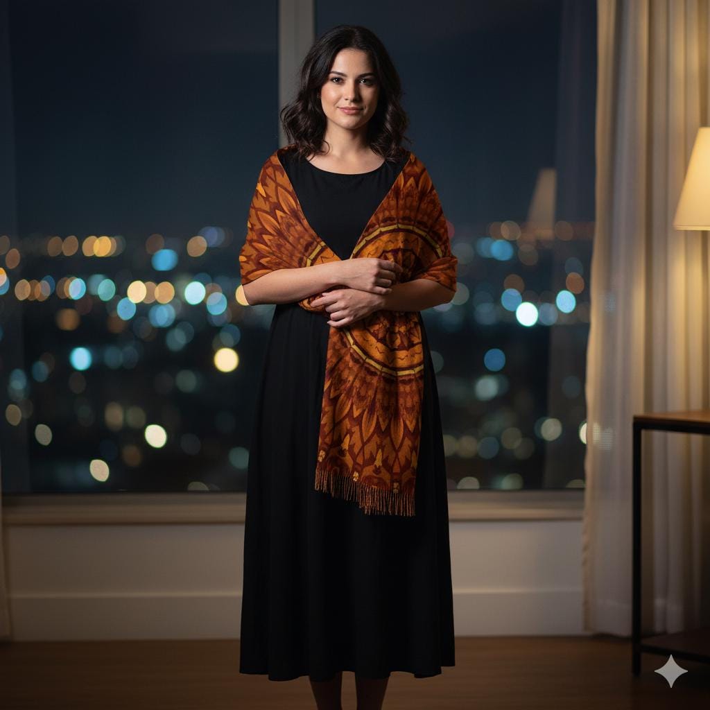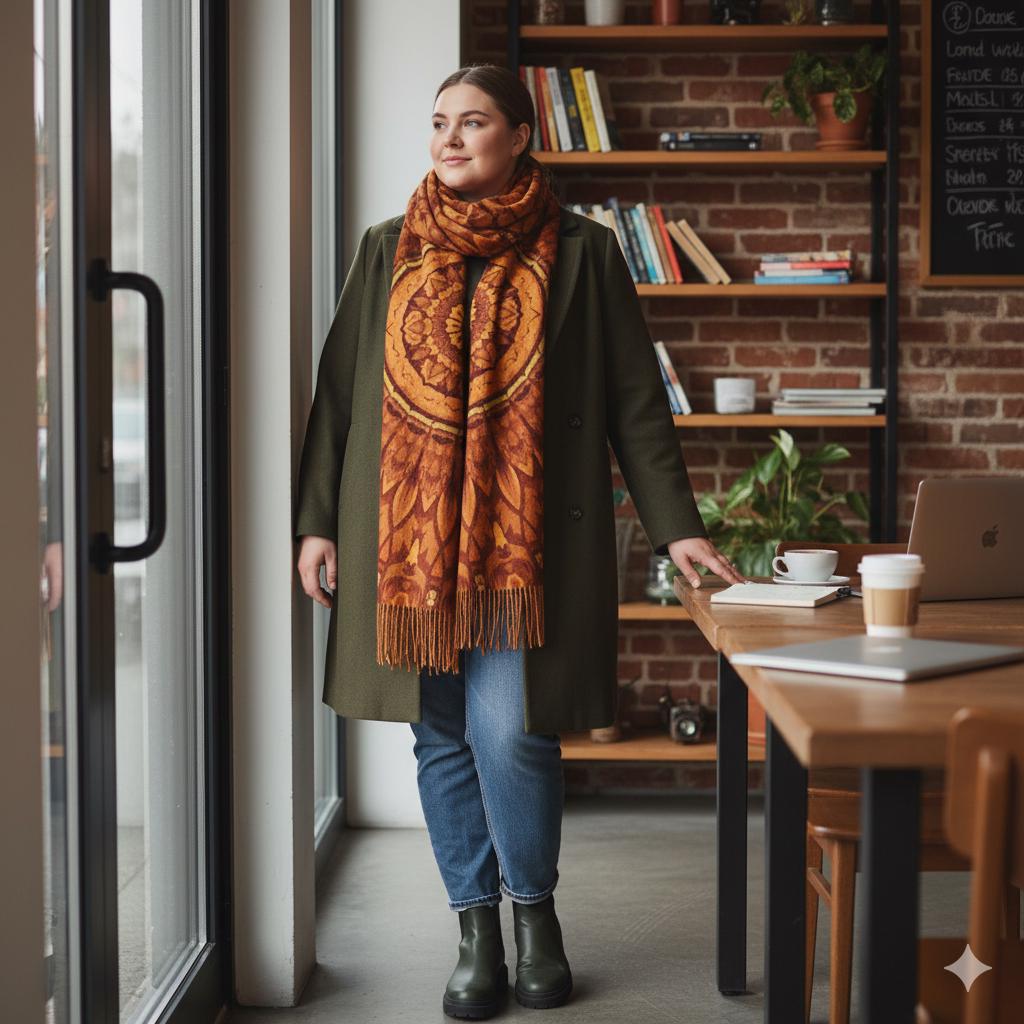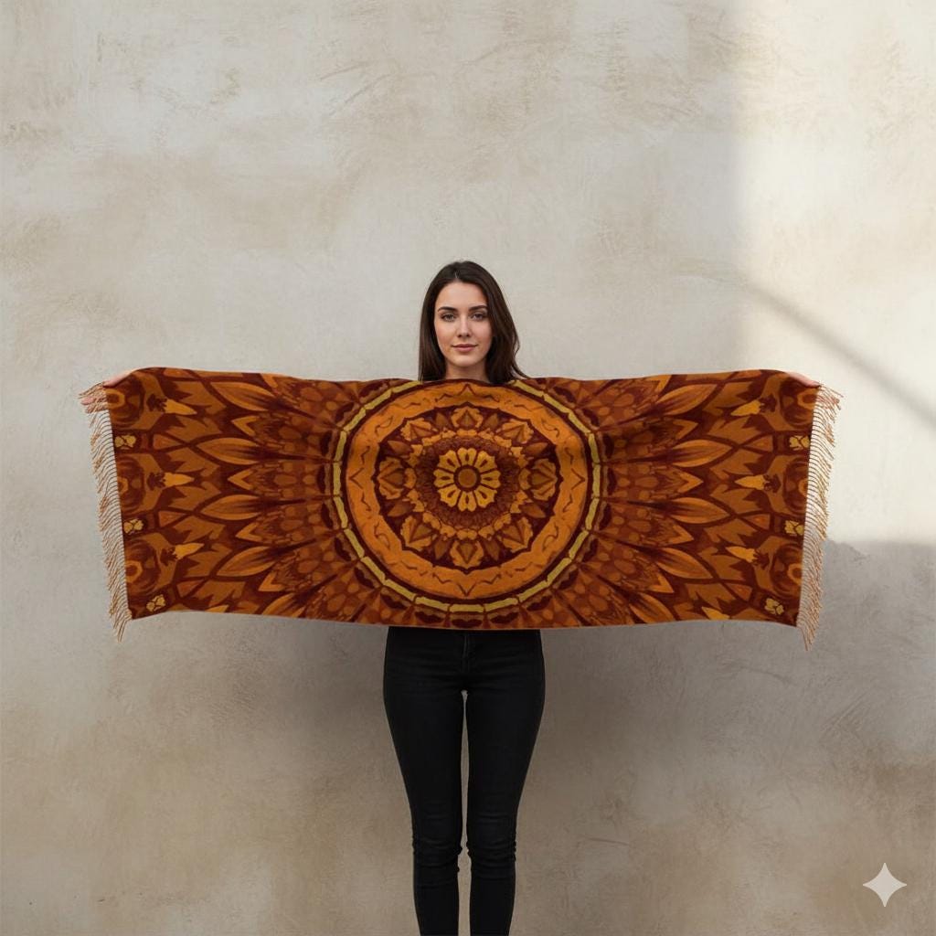 Il existe des accessoires qui transforment aussitôt une silhouette. Cette écharpe à franges, douce comme un nuage, apporte chaleur et caractère. Son mandala terracotta—impression par sublimation sur toute la surface—offre une couleur profonde et durable, parfaite pour les balades d’automne, les voyages et les soirées chic.