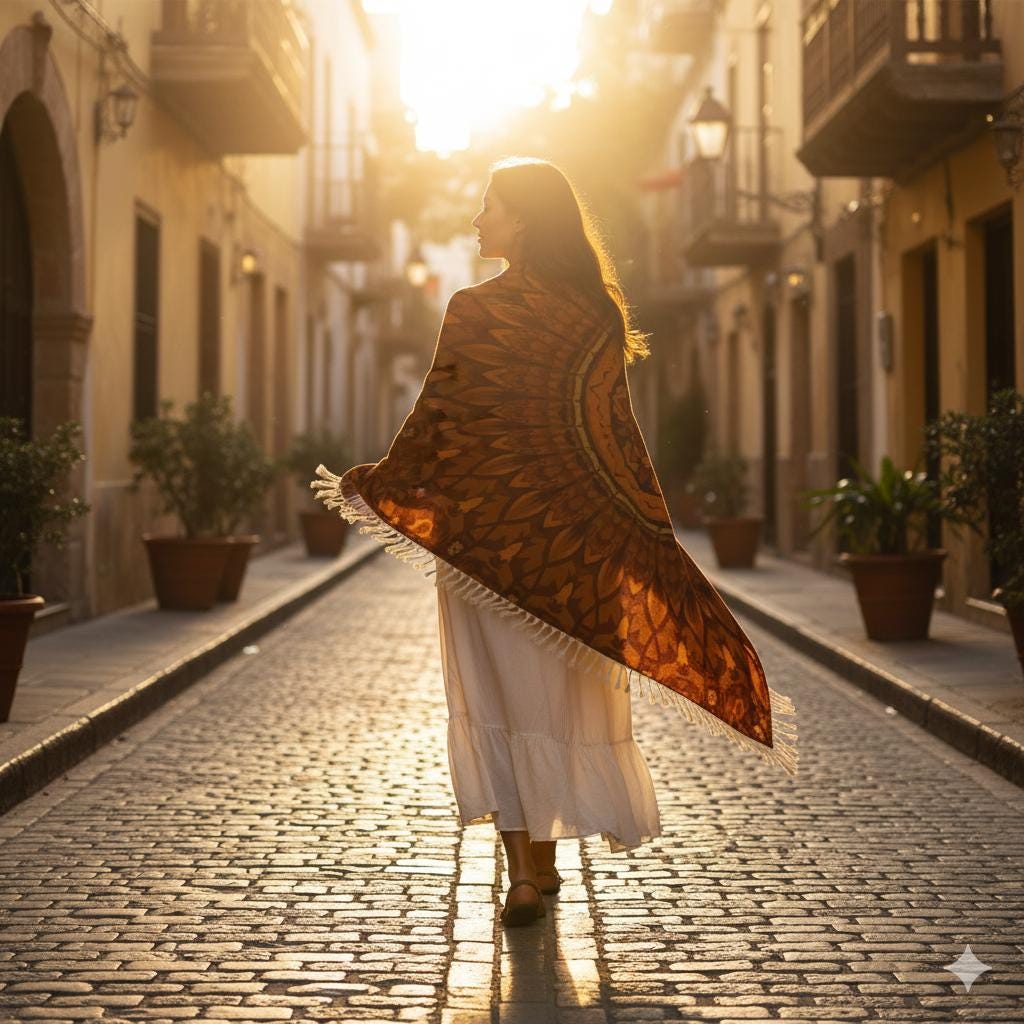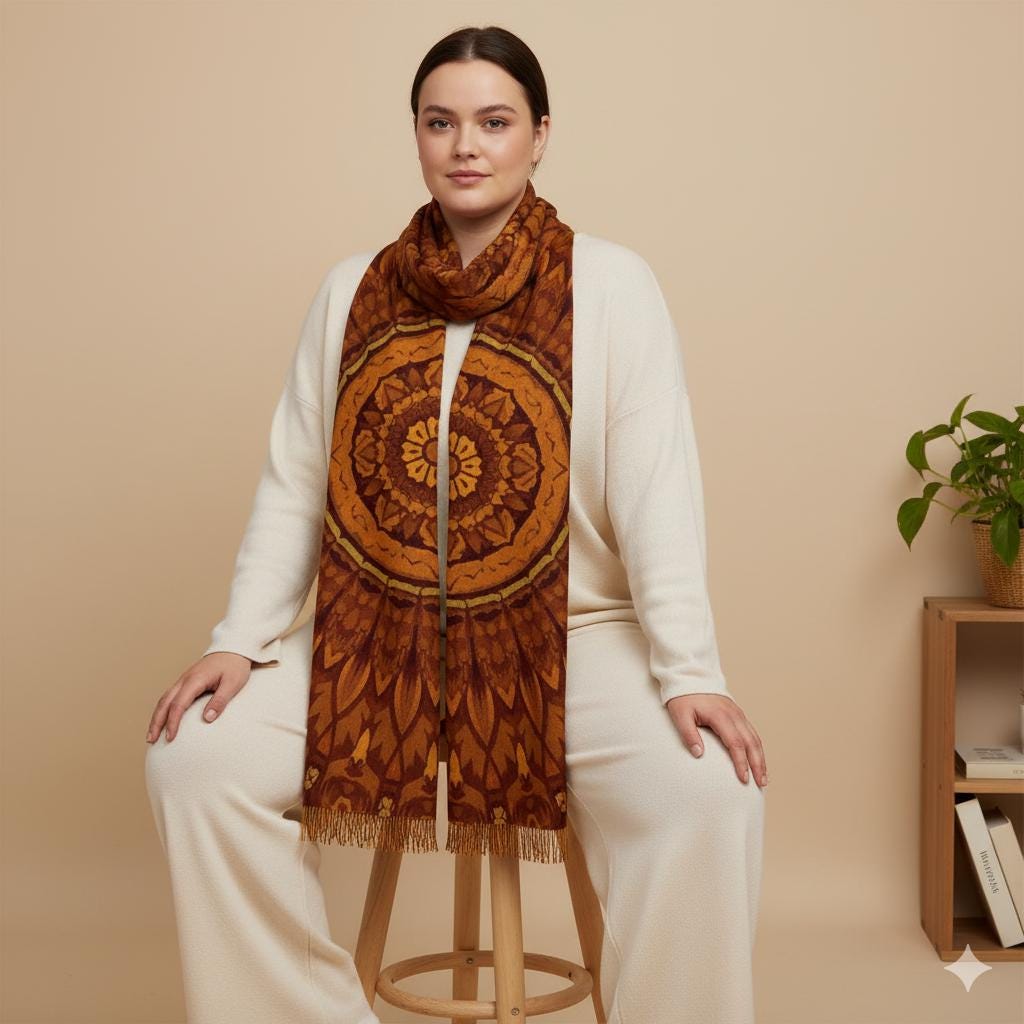 Un grand châle au toucher cachemire, léger et respirant. Imprimé mandala intégral aux tons chauds pour sublimer vos tenues. ✨