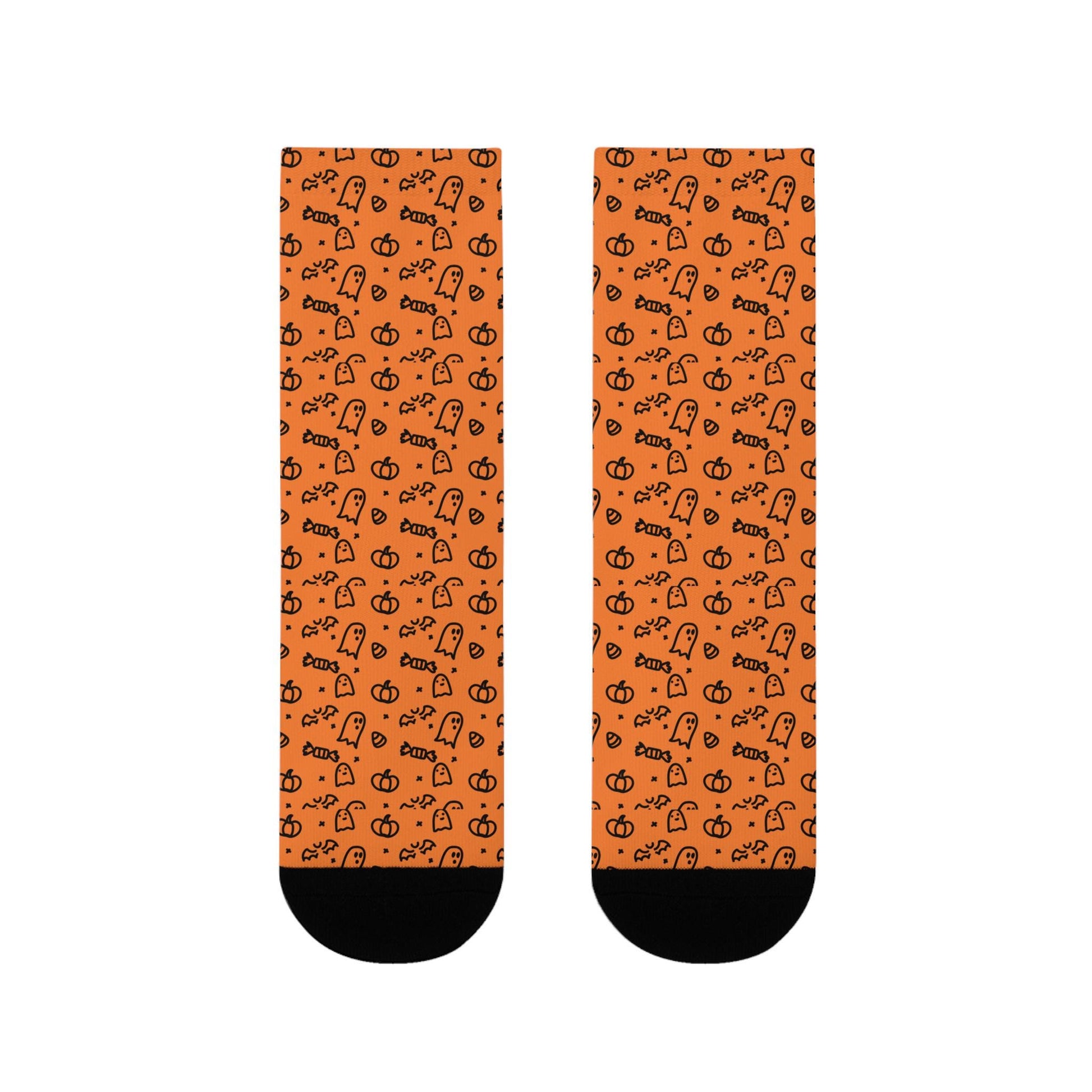 Chaussettes « Halloween » – fantômes & citrouilles, crew sublimées orange, cadeau festif automne