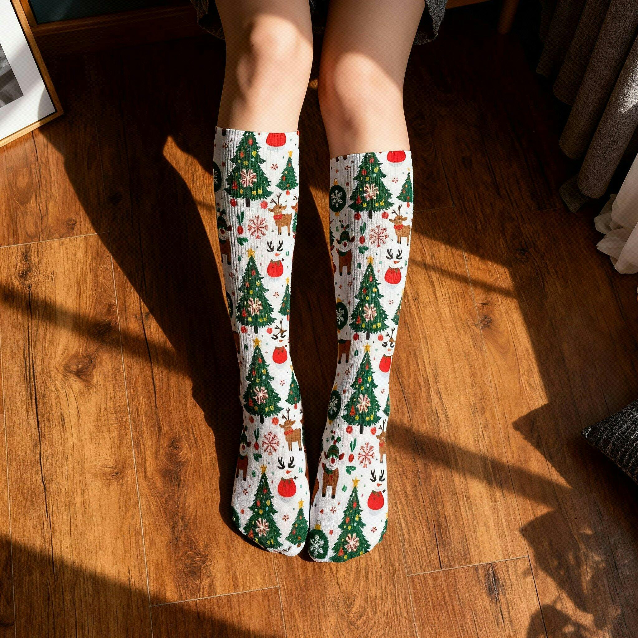 Chaussettes montantes blanches Noël | Rennes, sapins et boules | Respirantes & stretch | Mode inclusive Big Smiles