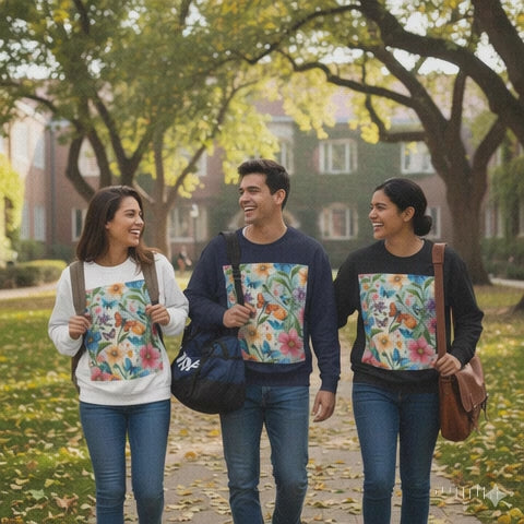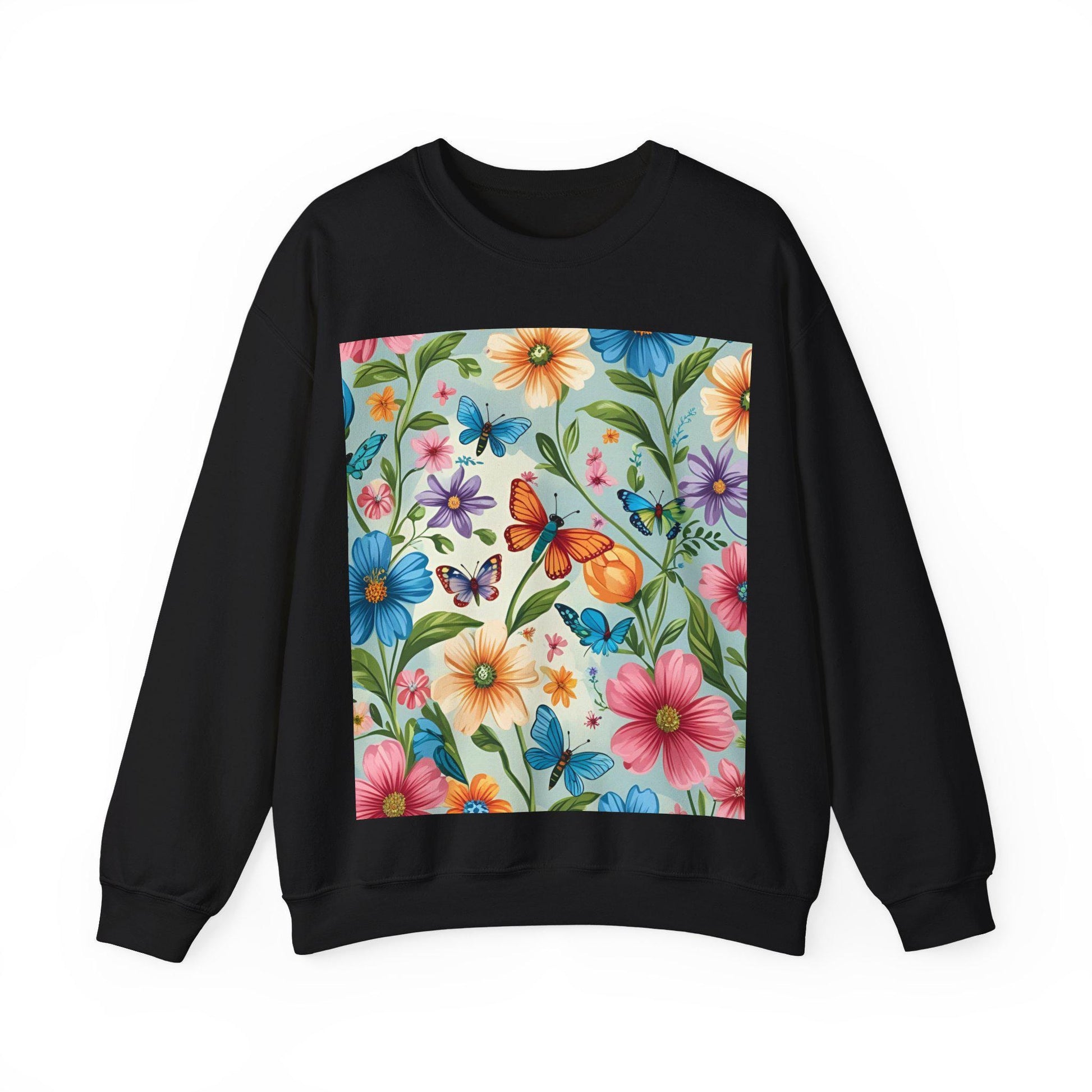 Sweat à col rond unisexe avec imprimé jardin et papillons. Tissu 50/50, intérieur molletonné et coupe relax pour un confort toute l’année.