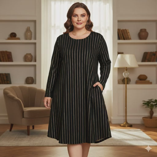 La robe facile et chic. Silhouette fluide qui couvre taille et hanches sans serrer, manches longues pour le confort et deux poches pratiques pour l’essentiel. Les rayures dorées verticales allongent la silhouette et apportent une touche moderne—parfaite avec baskets ou bottines, du bureau au dîner. Le tissu 95% polyester / 5% élasthanne est doux, extensible et l’impression en sublimation assure des couleurs durables.