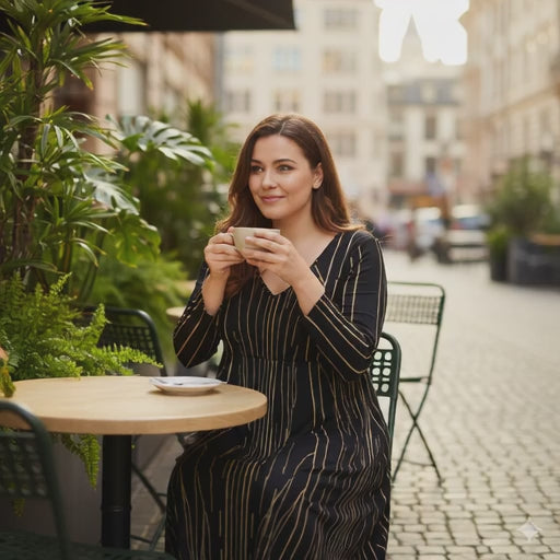Cette robe grande taille allie chic intemporel et confort absolu. Le col en V met le décolleté en valeur, la taille légèrement haute affine la silhouette et la jupe évasée tombe naturellement sans mouler.