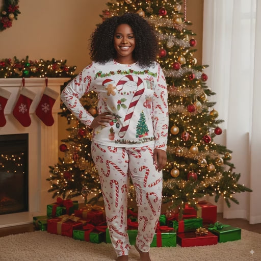 Pyjama festif 2 pièces (XS–6XL) avec haut manches longues et pantalon imprimé de bâtons de caramel, sapin de Noël et cadeaux.