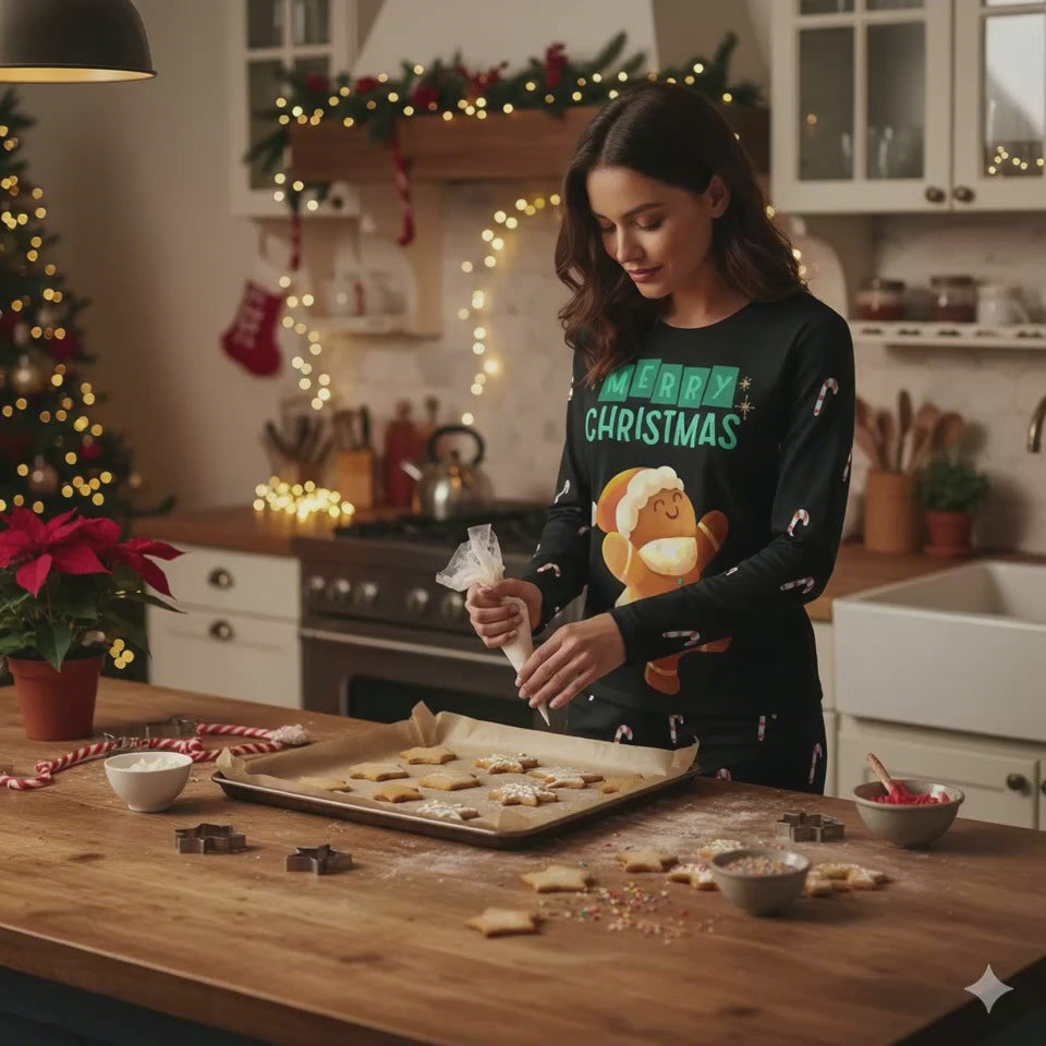 Doux, extensible et festif : haut « Merry Christmas » avec bonhomme pain d’épices + pantalon imprimé cannes de sucre, pour des soirées d’hiver ultra cozy. Les fêtes appellent le confort qui réchauffe et un clin d’œil gourmand. Cet ensemble 2 pièces en maille souple (95% polyester, 5% élasthanne) épouse le corps sans serrer, respire et suit vos mouvements. Le haut à col rond et manches longues affiche un joyeux bonhomme pain d’épices sous « Merry Christmas ». Le pantalon taille élastiquée, avec poches, reprend les candy canes all-over. À la maison, en weekend cocooning, pour le yoga doux ou à offrir, c’est le pyjama qui mêle esprit de Noël, douceur et liberté totale.