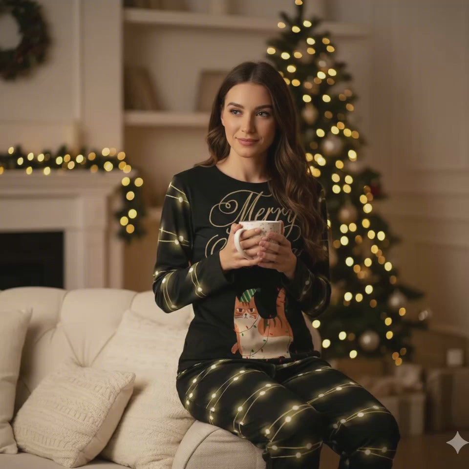 Doux, extensible et festif : haut « Merry Christmas » avec chat espiègle + pantalon à guirlandes lumineuses. Parfait pour les soirées d’hiver. Quand les fêtes approchent, on veut du confort qui réchauffe et un brin de magie. Cet ensemble 2 pièces en maille souple (95% polyester, 5% élasthanne) épouse vos mouvements sans serrer. Le haut à col rond et manches longues affiche un chat entouré de guirlandes, le pantalon à taille élastiquée et poches reprend l’imprimé lumineux pour un look 100% Noël. Idéal à la maison, en week-end cocooning ou à offrir : le pyjama qui combine esprit de fête, douceur et liberté de mouvement.