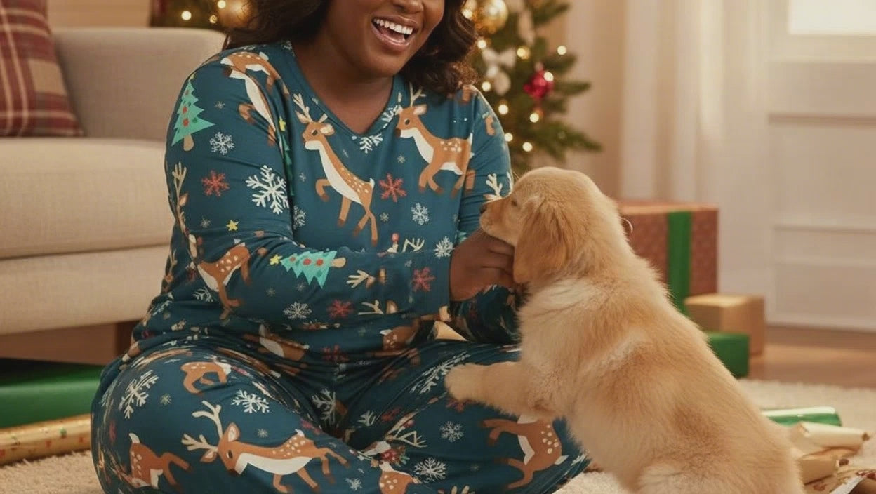 Quand le froid arrive, on veut un pyjama qui réchauffe le corps et l’humeur. Ce set Big Smiles offre une douceur moelleuse et une élasticité confortable pour dormir, chiller et fêter. L’imprimé all-over sur vert sapin reste éclatant grâce à la sublimation. Le haut col rond tombe fluide; le pantalon décontracté avec poches garde l’essentiel à portée de main. Taillant européen inclusif XS–6XL pour que chacune se sente bien.